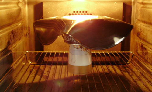 Τοποθετήσαμε στο φούρνο, μια ψηλότερη βάση (ένα ποτήρι και ένα μεταλλικό κουτί του καφέ) έτσι ώστε ο δίσκος βινυλίου να μπορέσει να καμφθεί περισσότερο.