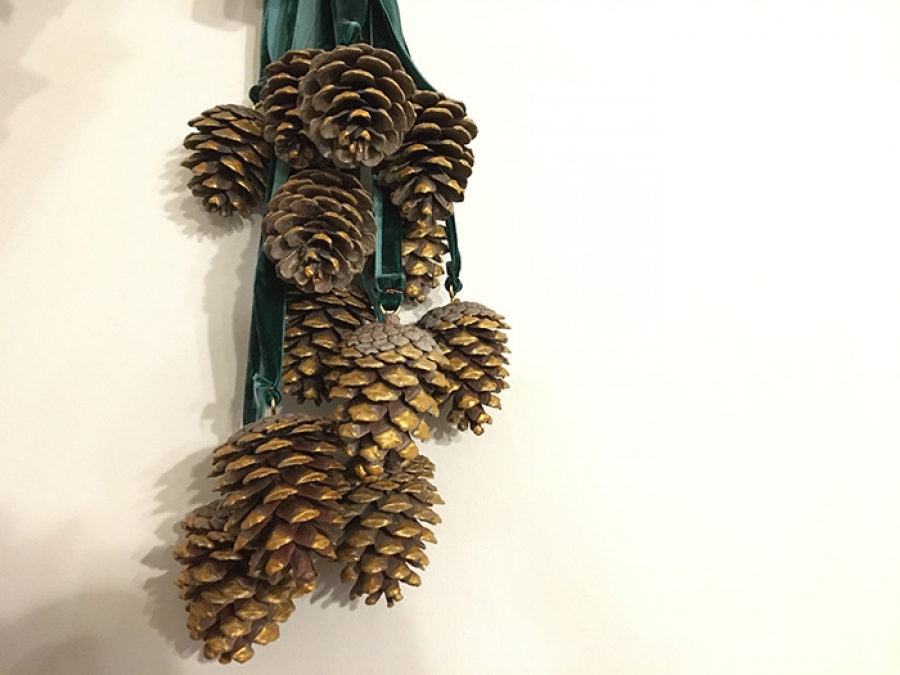 Αξιοποιείστε τα διακοσμητικά αντικείμενα που θυμίζουν Χριστούγεννα. Αντιπροσωπευτικά αντικείμενα είναι οι κουκουνάρες και τα κλαδιά από έλατο. Μπορείτε να αφήσετε τις κουκουνάρες στο φυσικό τους χρώμα ή να τις βάψετε εύκολα με spray σε χρυσό, ασημί ή άλλη χριστουγεννιάτικη απόχρωση. Οι κουκουνάρες δημιουργούν συνθέσεις με κλαδιά και με κορδέλες και τοποθετημένες σε πιατέλες ή δίσκους σε διάφορα σημεία του χώρου (τραπέζι καθιστικού, τραπεζαρίας) δίνουν το γιορταστικό τόνο στο χώρο. Εναλλακτικά βιδώστε στη βάση κάθε κουκουνάρας μια μικρή βίδα με κλειστό γάντζο και στερεώστε μια φαντεζί κορδέλα. Δημιουργήστε ένα σύνολο από κουκουνάρες που κρέμονται από κορδέλες σε διαφορετικά μήκη και κρεμάστε το από το φωτιστικό του χώρου ή στερεώστε το πάνω από το τζάκι.