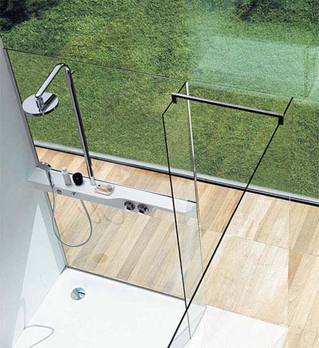 Στο ράφι αυτό από πολυουρεθάνη ενσωματώνονται το σύστημα ροής και μίξης του νερού, που έχει τη δυνατότητα να ρυθμίζει τη θερμοκρασία μέσα κι έξω από την καμπίνα , η λαβή του τηλεφώνου ντους, μια πρακτική χειρολαβή και φίλτρα προστασίας ολόκληρου του συστήματος.