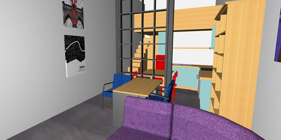 Στο βάθος χωροθετείται το λουτρό. Αν υφίσταται W.C επεκτείνεται για να μετατραπεί σε λουτρό, αλλιώς κατασκευάζεται νέο. Μπροστά του και σε επαφή χωροθετείται η περιοχή της κουζίνας για να αποχετευτεί στην υπάρχουσα αποχέτευση. Στο κέντρο της κουζίνας προτείνεται μικρή τραπεζαρία. Ένα ευρηματικό διαχωριστικό απομονώνει την κουζίνα από τον υπόλοιπο χώρο χωρίς ουσιαστικά να διακόπτει την ενότητα αλλά να επιτρέπει και το φυσικό φως να φθάνει μέχρι την κουζίνα. Μπροστά από το διαχωριστικό προτείνεται το γραφείο, ένα κάθισμα επισκέπτη και πίσω του η βιβλιοθήκη. Η περιοχή του καθιστικού προτείνεται στο μπροστινό τμήμα του καταστήματος δίπλα στην είσοδο και στον απέναντι τοίχο στηρίζεται η τηλεόραση που έχει διπλή χρήση, δηλ. διασκέδαση αλλά και προβολή των επαγγελματικών project του δημιουργού. Πίσω από την τζαμαρία της πρόσοψης ένα μπαούλο με μαξιλάρες εξασφαλίζει έξτρα χώρο καθιστικού και ταυτόχρονα αποθηκευτικό χώρο.