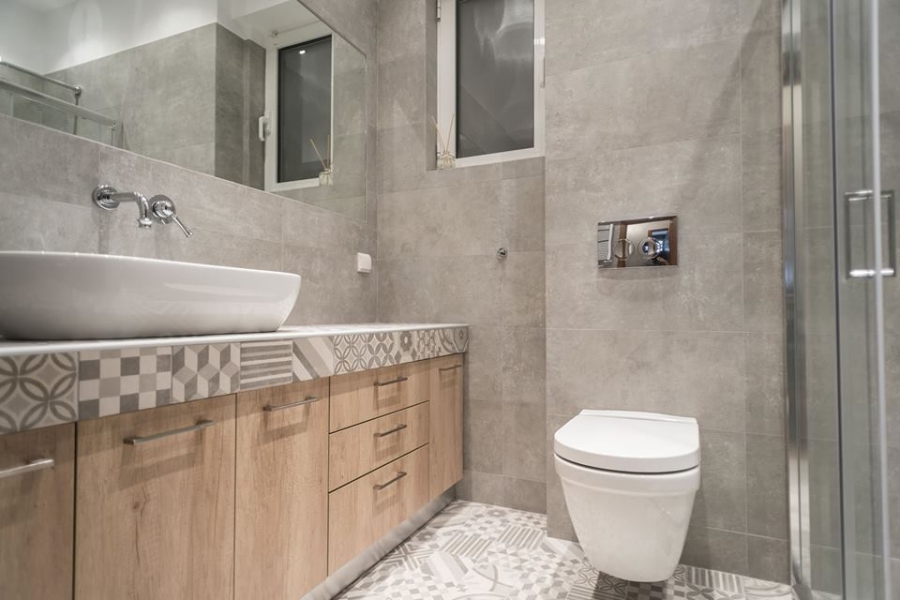 Ανακαίνιση μπάνιου στο Μαρούσι, από την κατασκευαστική εταιρεία του Ιωάννη Φούσκα. Η επιλογή των πλακιδίων patchwork σε στυλ ρετρό αποτελεί μια ιδιαίτερα επιτυχή επιλογή.
