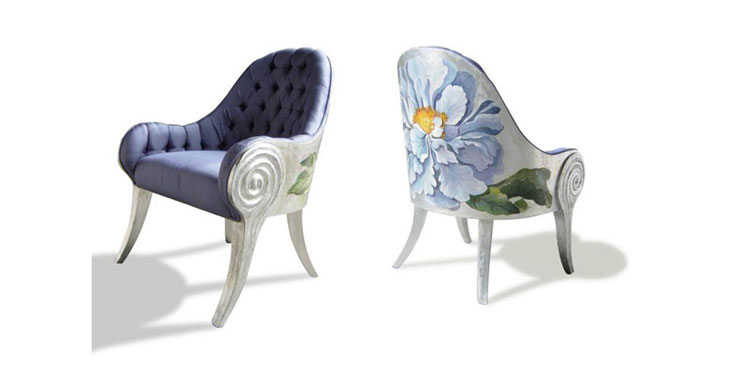 Η πολυθρόνα Lara Azzurra με ζωγραφισμένα στο χέρι λουλούδια σε ανάγλυφο φύλλο αργύρου από την ALCHYMIA