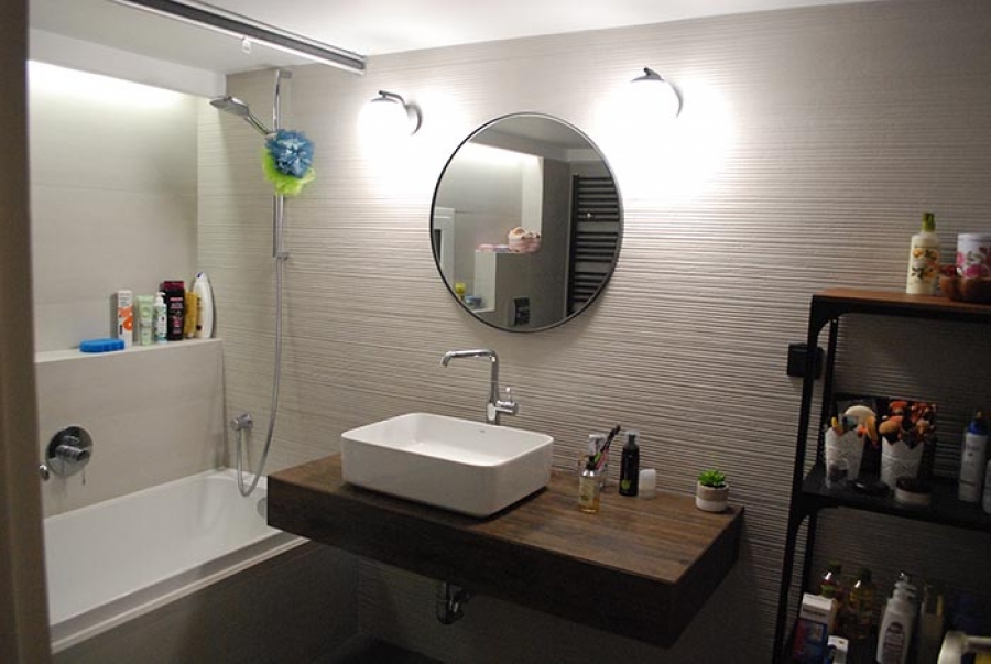 Κατά το σχεδιασμό αντιμετωπίσαμε το δίλημμα της εγκατάστασης μπανιέρας ή ντουζιέρας και το αντίστοιχο της τοποθέτησης του πλυντηρίου μέσα στο μπάνιο. Προκειμένου για επιλογή μπανιέρας ή ντουζιέρας εξετάσαμε την καθημερινότητα και τις συνήθειες της οικογένειας, δηλ. πόσο συχνή είναι η χρήση της μπανιέρας. Επίσης εξετάσαμε αν η τοποθέτηση ντουζιέρας προσθέτει ευρυχωρία, ακόμη και δυνατότητα αποθηκευτικού χώρου στο μπάνιο. Για να εξασφαλιστεί η άνεση στις κινήσεις μέσα στο μπάνιο κατά το σχεδιασμό λήφθηκε υπόψη ο εργονομικά απαιτούμενος ελάχιστος χώρος γύρω από τα είδη υγιεινής, οπότε αν το μέγεθος του μπάνιου είναι επαρκές επιλέγεται τοποθέτηση μπανιέρας. Η εργονομία υπαγορεύει ακόμη την τοποθέτηση των ειδών υγιεινής και των διάφορων αξεσουάρ στο σωστό ύψος για άνετη χρήση τους, όπως για παράδειγμα η τοποθέτηση λαβών για ασφαλή κίνηση και όχι μόνον για ΑΜΕΑ.