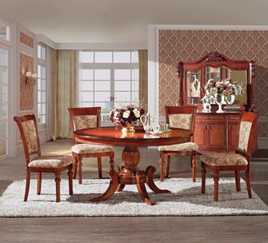 Μια ιδανική τραπεζαρία για συναθροίσεις και επιτραπέζια παιχνίδια επιβάλλεται να έχει στρογγυλό ή οβάλ σχήμα. Η συγκεκριμένη επιλογή είναι αρκετά κλασική, κομψή και το ζεστό κόκκινο χρώμα του ξύλου θα κάνει το σαλόνι σας να δείχνει πολύ φιλόξενο και οικείο.