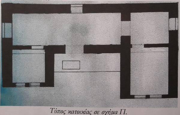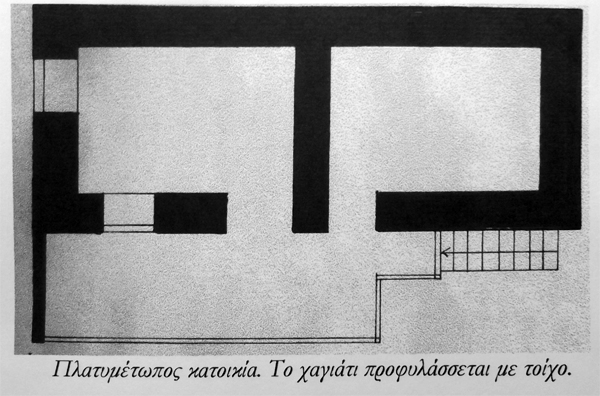 Το εγκάρσιο σκέλος προβάλει στον όροφο και στο επίμηκες διαμορφώνεται το χαγιάτι.