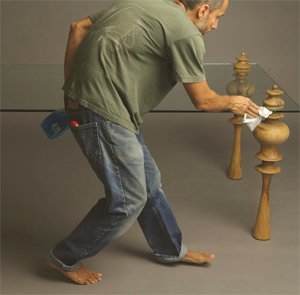 O δημιουργός των τραπεζιών, χρησιμοποιεί σαν υλικό το ξύλο αλλά προσπαθεί να μην συμβάλει στο πρόβλημα της αποψίλωσης των δασών. Για αυτό το λόγο βρίσκει δέντρα που έχουν πέσει μόνα τους στο έδαφος. Στη συνέχεια τα επεξεργάζεται με μεγάλη προσοχή και επιμέλεια (ξήρανση, τορνάρισμα, χρωματισμός κλπ) έτσι ώστε να μεταμορφωθούν σε ανθεκτικά και περίτεχνα πόδια.