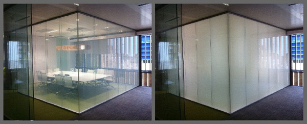 Ηλεκτροχρωμικό γυαλί με επίστρωση, η οποία με εφαρμογή χαμηλής ηλεκτρικής τάσης ρυθμίζει την ορατότητα μέσω του γυαλιού (από διαφανές γίνεται γαλακτόχρωμο).