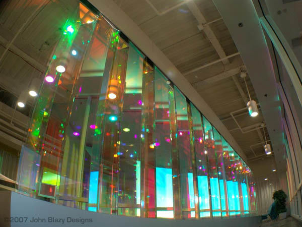 Γυαλί διχρωικό, το οποίο αποτελείται από συγκολλητά φύλλα με ενσωματωμένο λεπτό διχρωικό φιλμ, το οποίο αλλάζει χρώμα στο πλήρες φάσμα ανάλογα με τη γωνία θέασης.