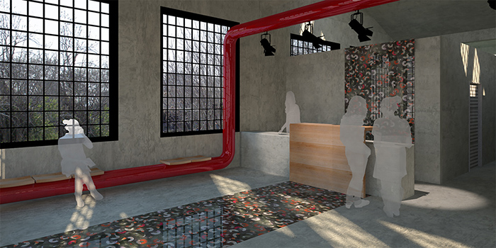 Πολυχώρος: Ο χώρος υποδοχής του κοινού στον πολυχώρο. Χαρακτηριστικό στοιχείο ο κόκκινος σωλήνας που διασχίζει το κτίριο, με διάφορες λειτουργίες (είτε ως κάθισμα, είτε ως φορέας καλωδιώσεων, είτε ως σωλήνας εξαερισμού). Επίσης χαρακτηριστικό στοιχείο αποτελεί και το δάπεδο φτιαγμένο από παλιά βινύλια το οποίο και οριοθετεί θα μπορούσαμε να πούμε την πορεία προς την υποδοχή.