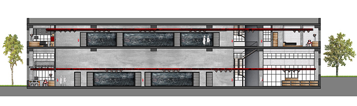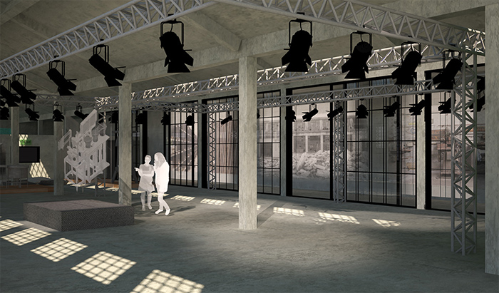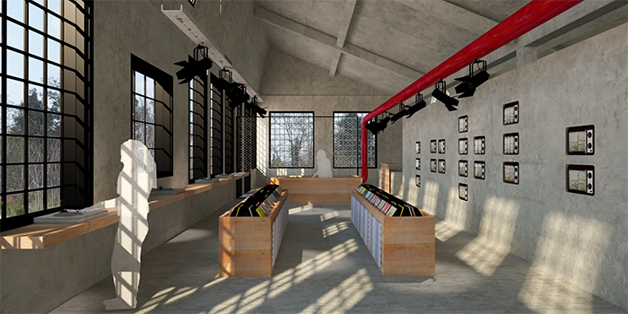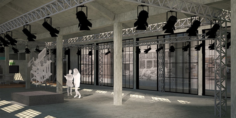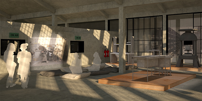 Πολυχώρος: Χώρος προβολών και εκθεσιακός χώρος με εκθέματα παλιά μηχανήματα που βρέθηκαν στο εγκαταλελειμμένο εργοστάσιο. Στα αριστερά φαίνονται και τα παράθυρα που επιτρέπουν την οπτική επαφή με το στούντιο ηχογραφήσεων και τον ραδιοφωνικό σταθμό.