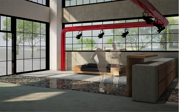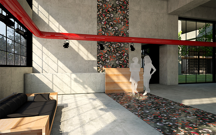 Κατοικίες-Lofts: Ο χώρος υποδοχής στο κτίριο αυτό έχει κοινή αντιμετώπιση με αυτόν του πολυχώρου. Στο βάθος βλέπουμε το κεντρικό αίθριο.