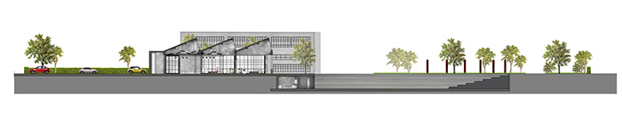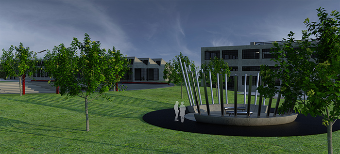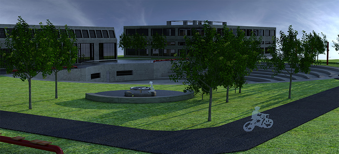 Εξωτερικός χώρος- Μουσικό πάρκο: Παρατηρούμε το κυκλικό αμφιθέατρο που βυθίζεται μπροστά από τα άλλα δύο κτίρια και σε πρώτο πλάνο ένα μουσικό παιχνίδι (HARP music instrument) και τον ποδηλατόδρομο.