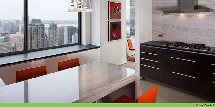 Οι περισσότεροι χώροι του διαμερίσματος είναι ανοιχτοί προς την εντυπωσιακή θέα που περιλαμβάνει μερικά από τα πιο γνωστά σημεία της πόλης όπως το central Park και τον ποταμό Hudson.