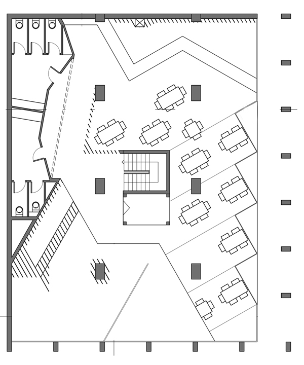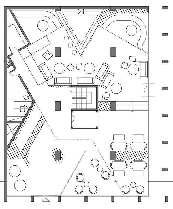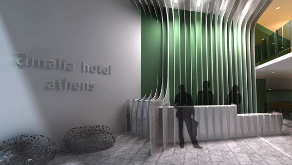 Το πιο δυναμικό στοιχείο σε όλο το χώρο είναι η reception ( το πιο σημαντικό κομμάτι σ’ ένα ξενοδοχείο), η οποία αποτελείται από επαναλαμβανόμενα κάθετα στοιχεία που εκτείνονται από την οροφή και τον τοίχο ως το πάτωμα, όπου σχηματίζουν και τον πάγκο εξυπηρέτησης. Αυτά τα στοιχεία εμφανίζονται και στους υπόλοιπους χώρους, ως τρισδιάστατες εφαρμογές στους τοίχους ή στα υποστηλώματα, ως διαχωριστικά στοιχεία κτλ.