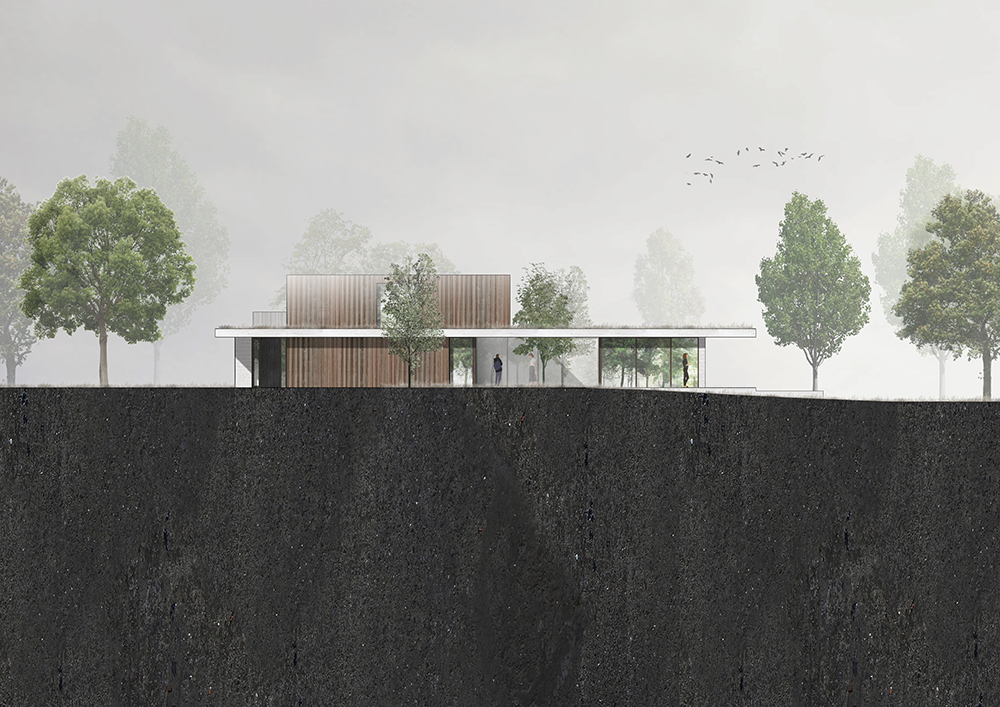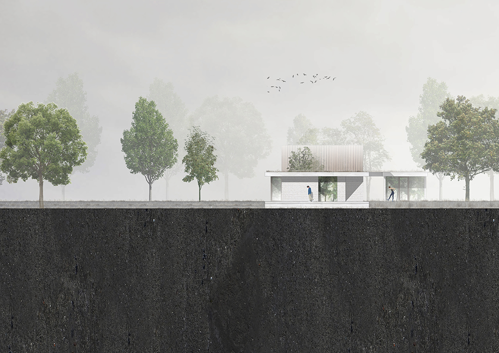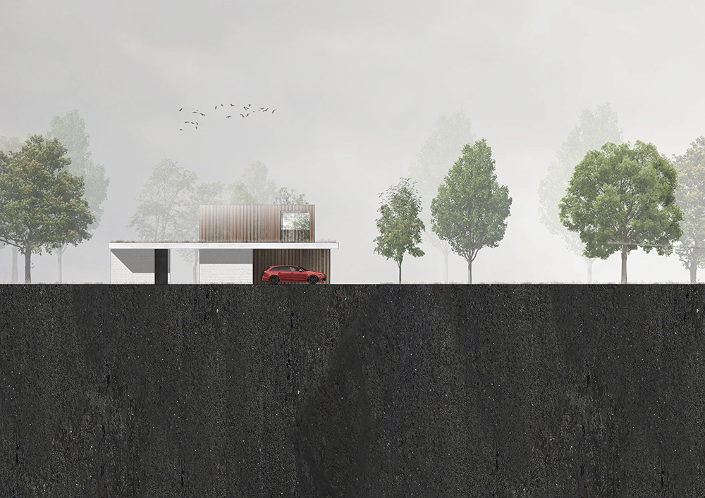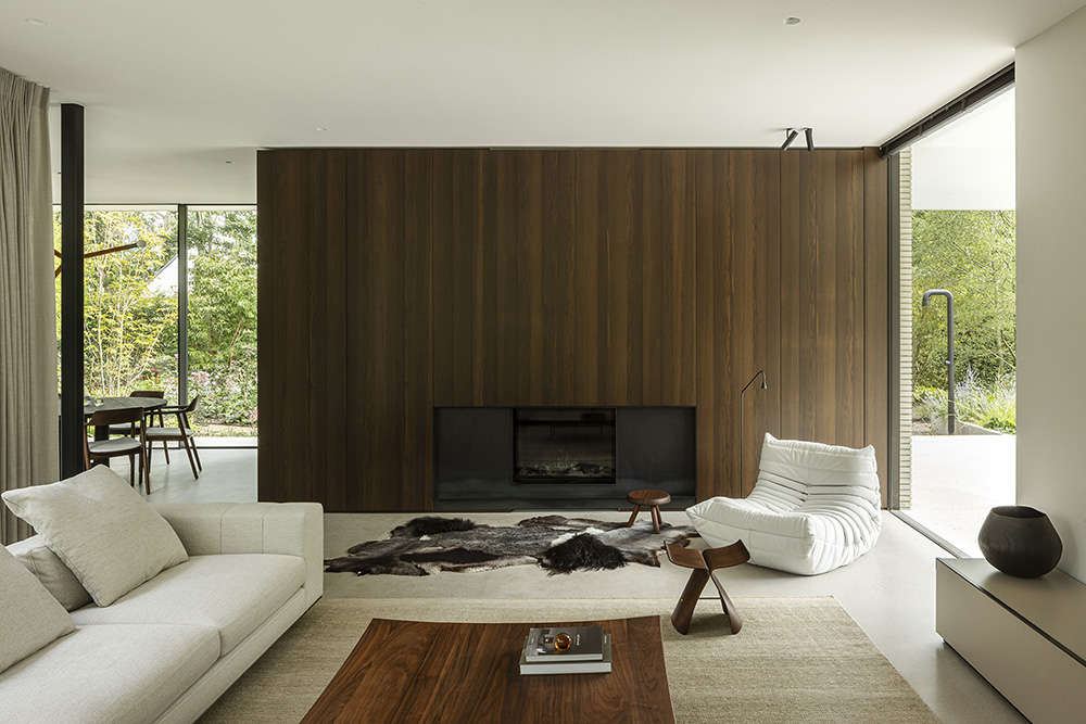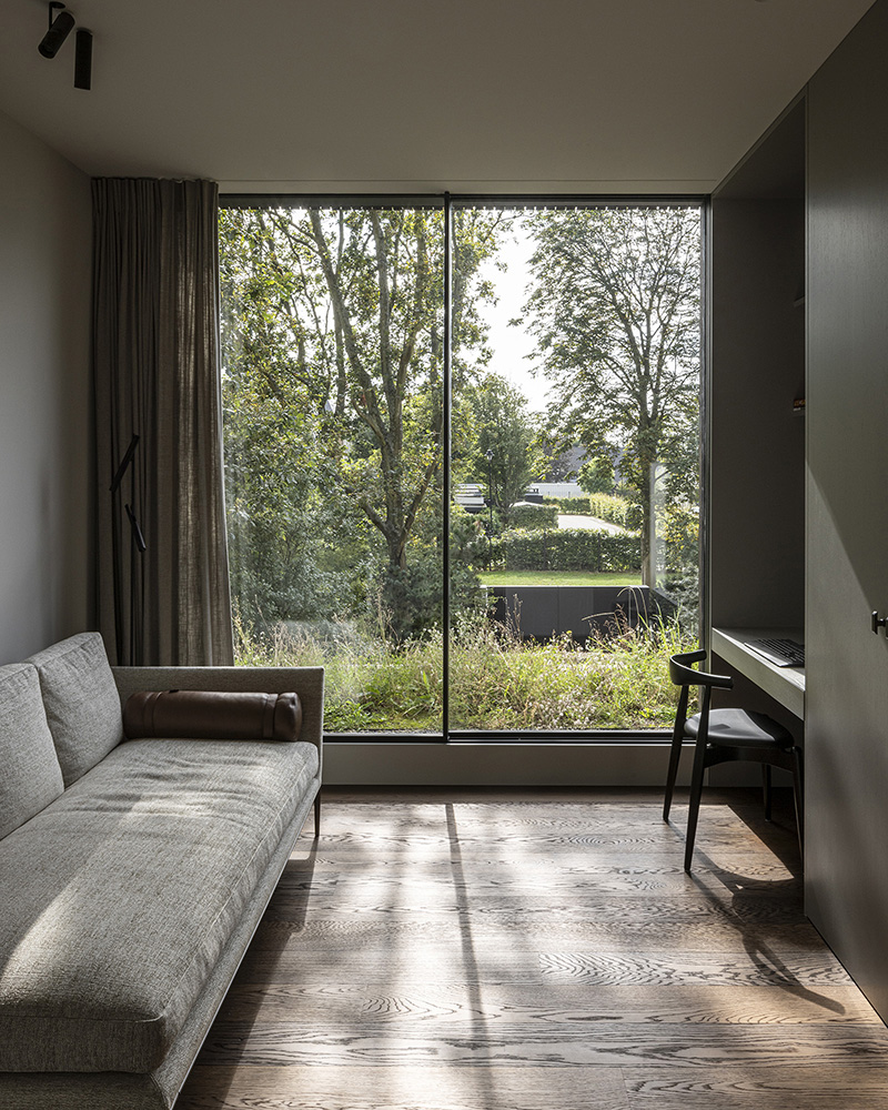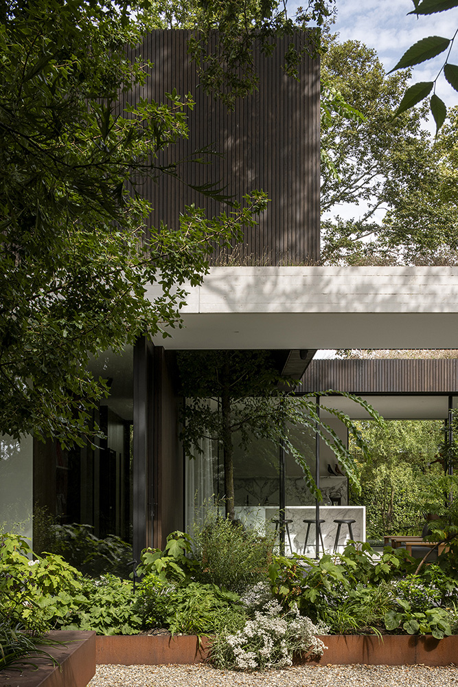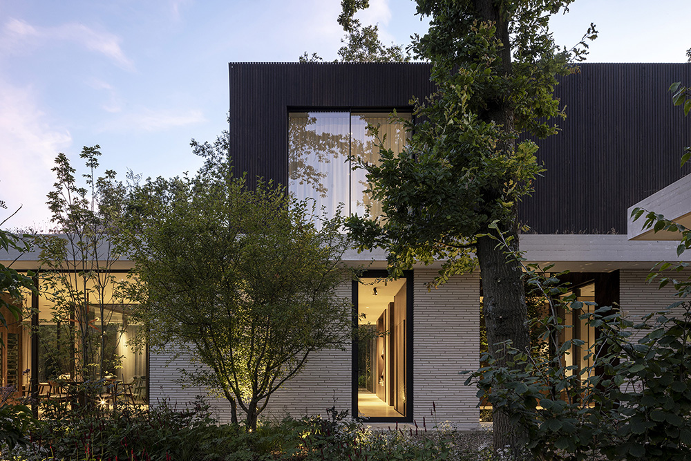 Ένα ισορροπημένο μείγμα υλικών —ξύλο, πέτρα, σκυρόδεμα και γυαλί— προσδίδει στην εξωτερική όψη μια εκλεπτυσμένη, πολυτελή αίσθηση. Η είσοδος, τα αίθρια και οι προσόψεις του πρώτου ορόφου είναι επενδεδυμένα με ξύλο μελιάς επεξεργασμένο με λάδι, ενώ η νότια και η ανατολική πρόσοψη στο επίπεδο του ισογείου και το βοηθητικό κτίριο είναι κατασκευασμένα από ανοιχτόχρωμα τούβλα Kolumba. Τα δάπεδα και οι οροφές εκτείνονται συνεχόμενα από τους εσωτερικούς στους εξωτερικούς χώρους, με λευκά δάπεδα σκυροδέματος να περιβάλλουν το σπίτι και να διαμορφώνουν τις εξωτερικές άκρες των στεγάστρων. Οι οροφές είναι φινιρισμένες με στόκο, ενώ τα μινιμαλιστικά κουφώματα αλουμινίου και οι μεγάλοι υαλοπίνακες ενισχύουν τη σύνδεση μεταξύ του εσωτερικού χώρου και του κήπου.