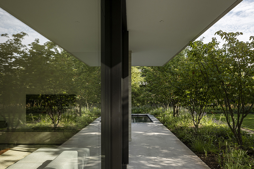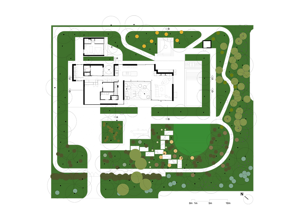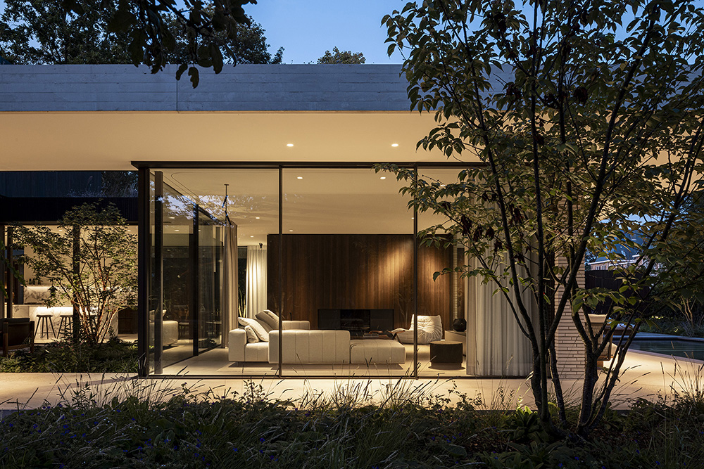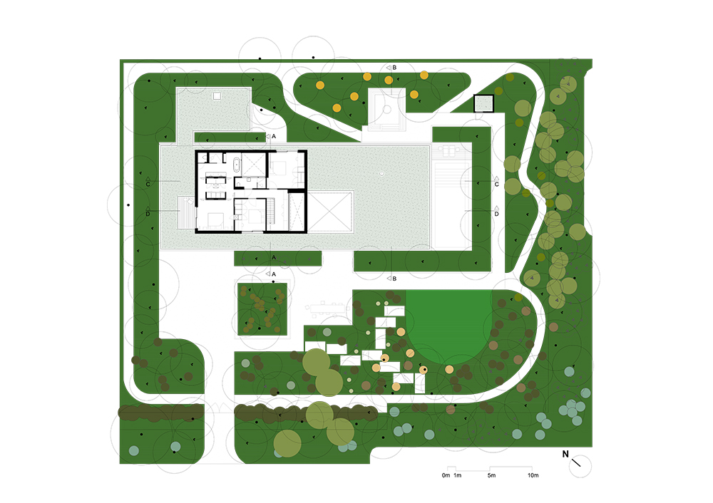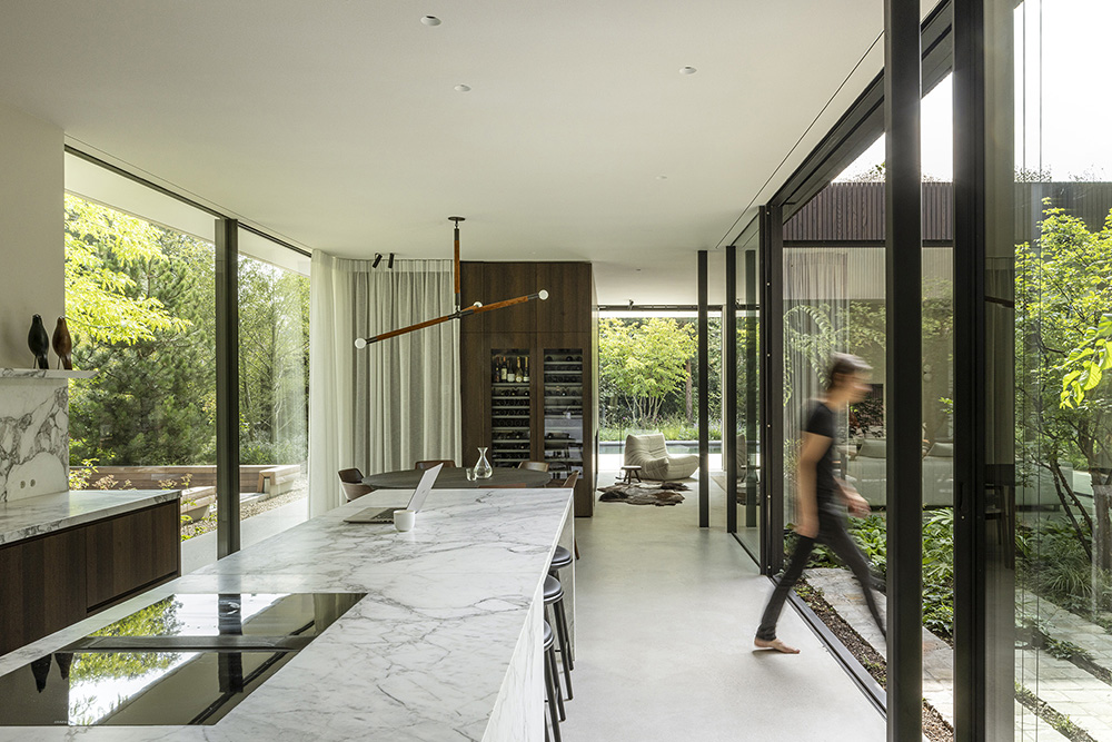 Η βλάστηση τυλίγεται γύρω από τη βίλα, διαπερνώντας τα αίθρια και συνδυάζοντας τη φύση με τη χτισμένη δομή, δημιουργώντας μια αρμονική αλληλεπίδραση μεταξύ του τοπίου, της αρχιτεκτονικής και του εσωτερικού σχεδιασμού.