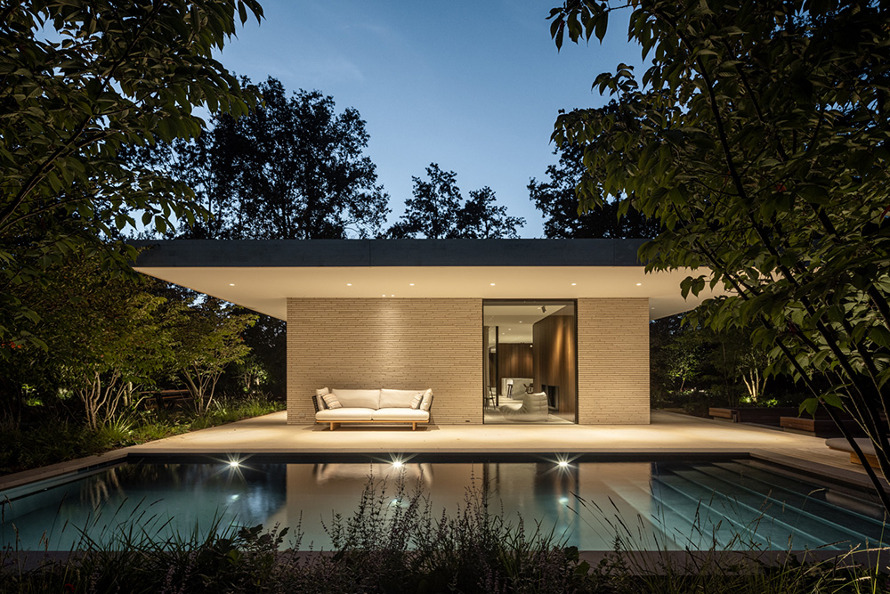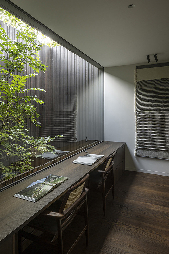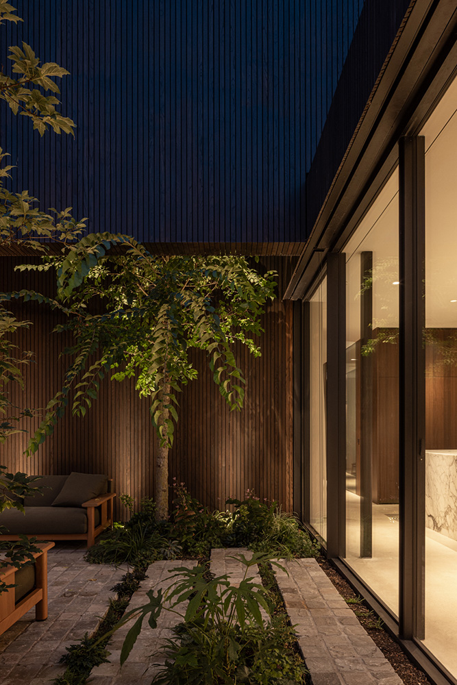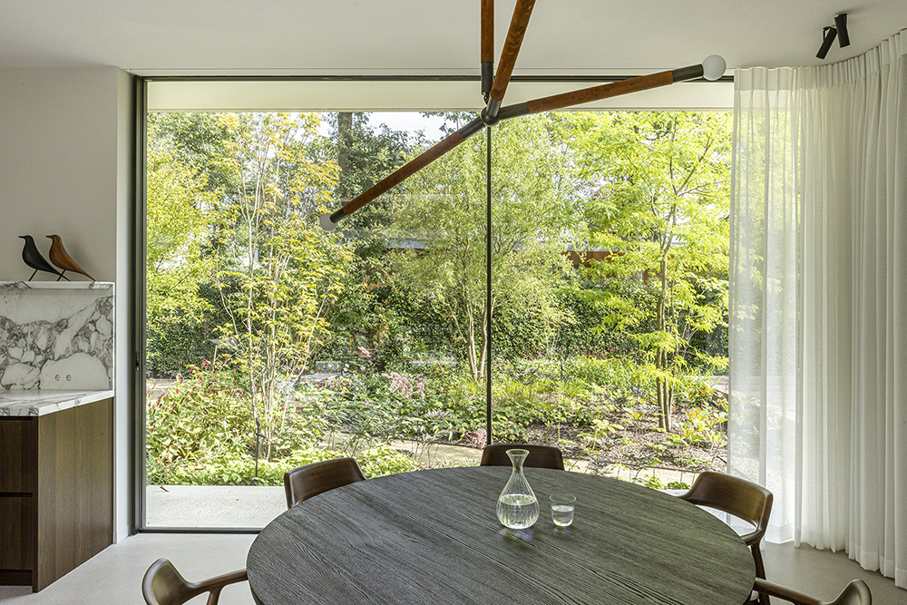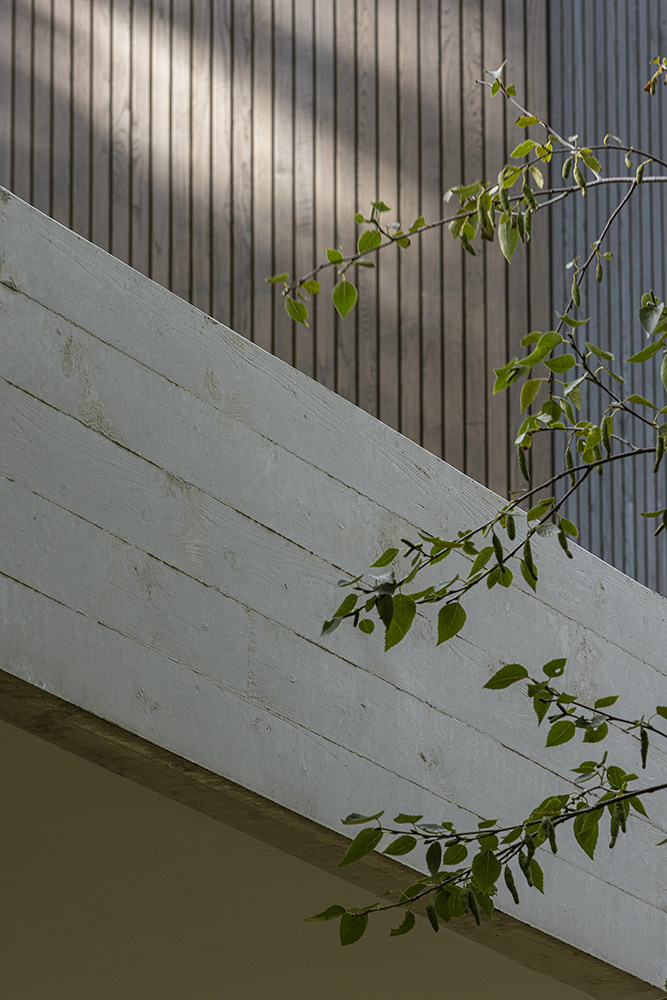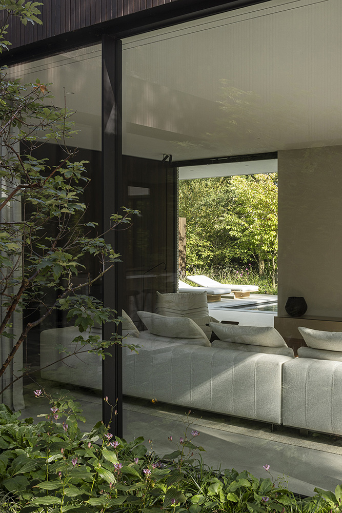Η βλάστηση τυλίγεται γύρω από τη βίλα, διαπερνώντας τα αίθρια και συνδυάζοντας τη φύση με τη χτισμένη δομή, δημιουργώντας μια αρμονική αλληλεπίδραση μεταξύ του τοπίου, της αρχιτεκτονικής και του εσωτερικού σχεδιασμού.