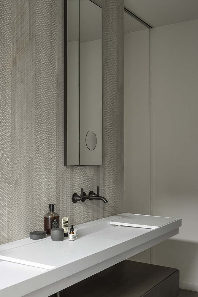Πλούσια υλικά όπως πάνελ βελανιδιάς με σκούρο λάδι, συνεχόμενα λευκά δάπεδα σκυροδέματος και χαρακτηριστικά στοιχεία της κουζίνας από φυσική πέτρα προσφέρουν μια αίσθηση αριστοτεχνίας. Τα μπάνια και οι τουαλέτες είναι διακοσμημένα με ποικιλία πλακιδίων. Ο φωτισμός προσαρμόζεται προσεκτικά σε κάθε χώρο και διάθεση, με συστήματα ελεγχόμενα από KNX (κτιριακός αυτοματισμός) που προσφέρουν προσαρμόσιμες ρυθμίσεις περιβάλλοντος.
