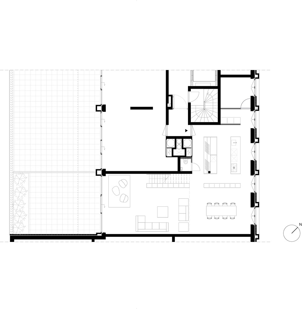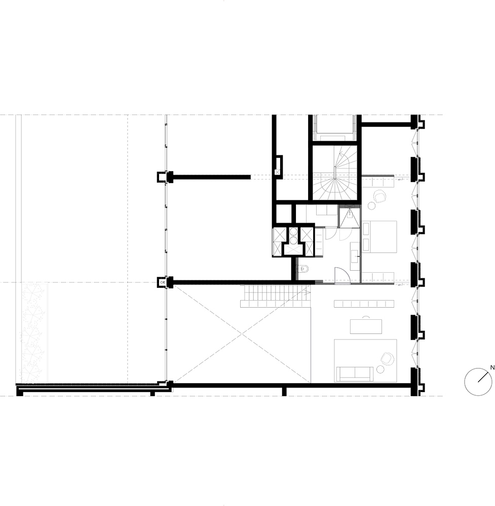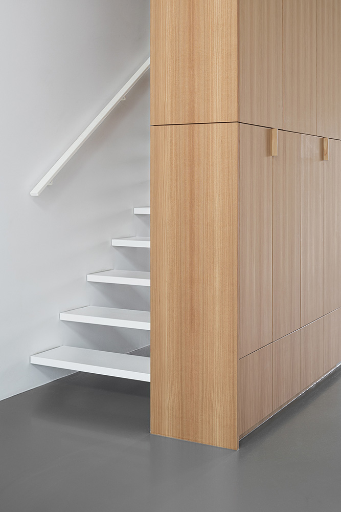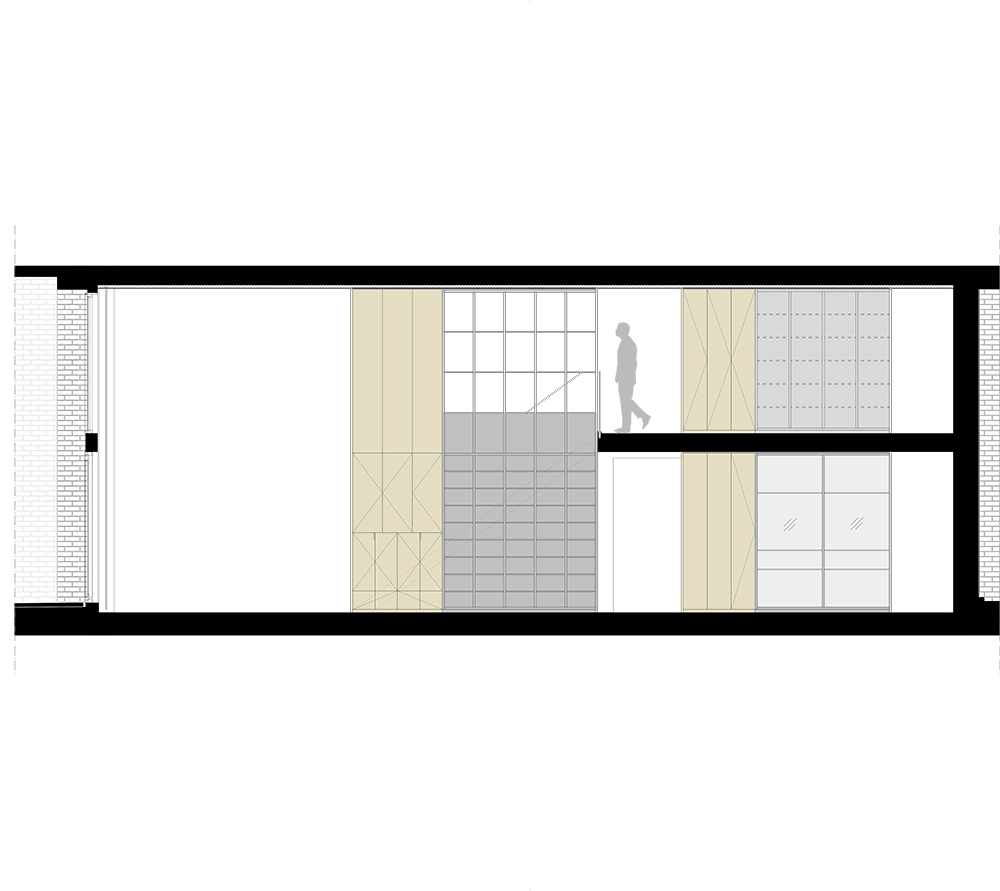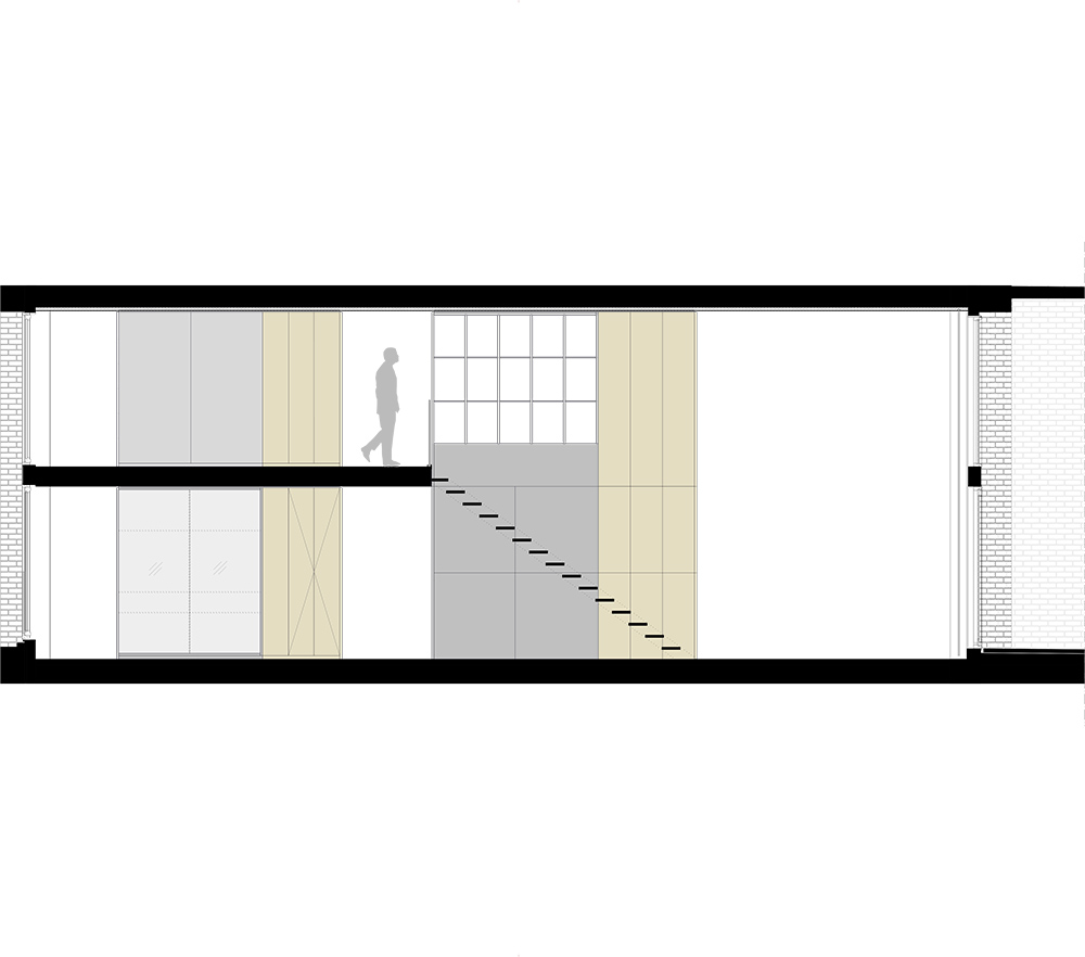 Στο ισόγειο βρίσκονται ο χώρος της εισόδου, η κουζίνα και το καθιστικό σε οργάνωση ανοιχτής κάτοψης, ενώ εκμεταλλευόμενοι το διπλό ύψος του χώρου διαμορφώνουν ένα επίπεδο παταριού που φιλοξενεί ένα υπνοδωμάτιο, ένα γραφείο και ένα μπάνιο. Τα μεγάλου ύψους ντουλάπια συνδέουν οπτικά τα δύο επίπεδα λειτουργώντας ως διαχωριστικό και κρύβουν την εσωτερική σκάλα που συνδέει τα δύο επίπεδα.