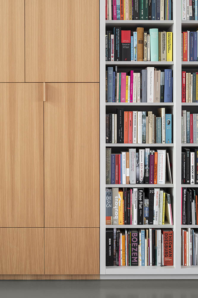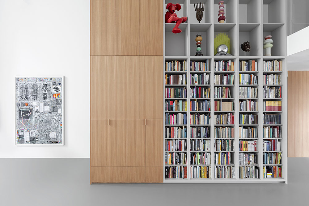 “Η προβολή των έργων τέχνης αποτέλεσε για μας την αφετηρία σχεδιασμού, έτσι σχεδιάσαμε ντουλάπια ύψους δύο ορόφων με ενσωματωμένες γυάλινες προθήκες για την προβολή των έργων τέχνης” αναφέρουν οι μελετητές.