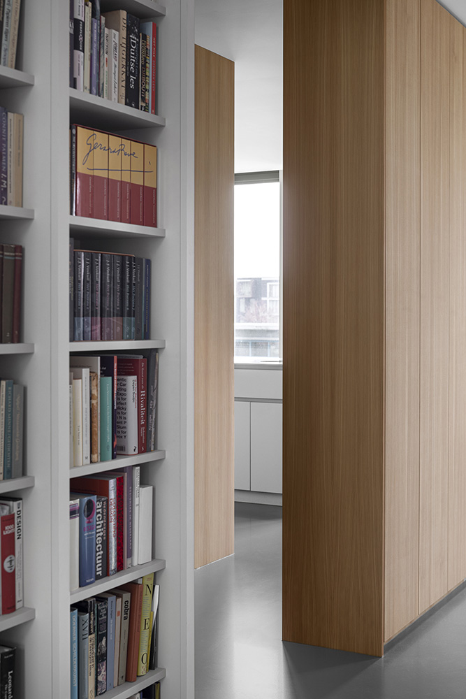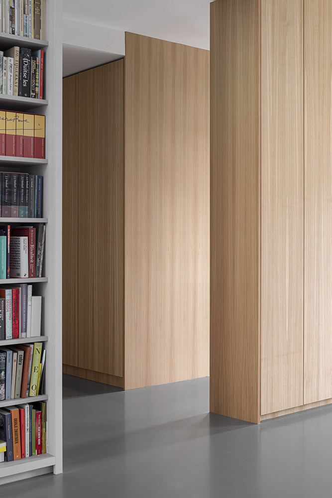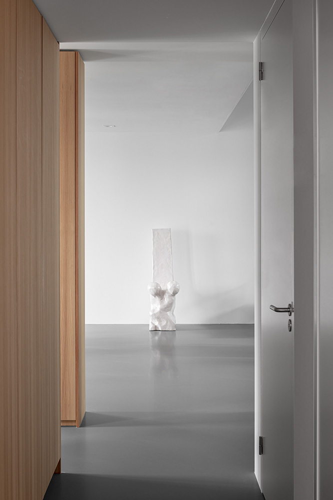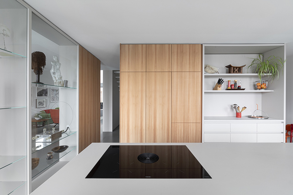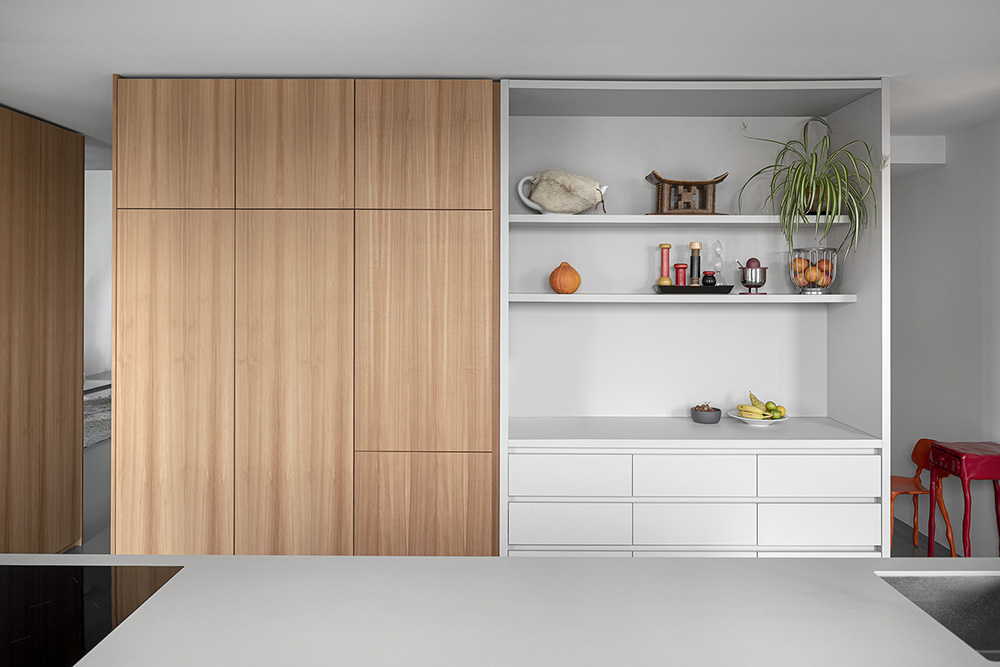 Όλες οι κατά παραγγελία κατασκευές, κουζίνα και ντουλάπια στο διαμέρισμα έχουν φινιρίσματα σε συνδυασμό επιφανειών από ξύλο και ματ γκρίζου χρώματος. Οι λιτές και απλές χωρικές παρεμβάσεις έρχονται σε αντίθεση με τα πολύχρωμα έργα τέχνης ισορροπούν και αλληλοσυμπληρώνονται, ενώ η λαμπερή λιτότητα του ρητινούχου δαπέδου ενοποιεί και αναδεικνύει το αρμονικό σύνολο χρωμάτων και υφών.