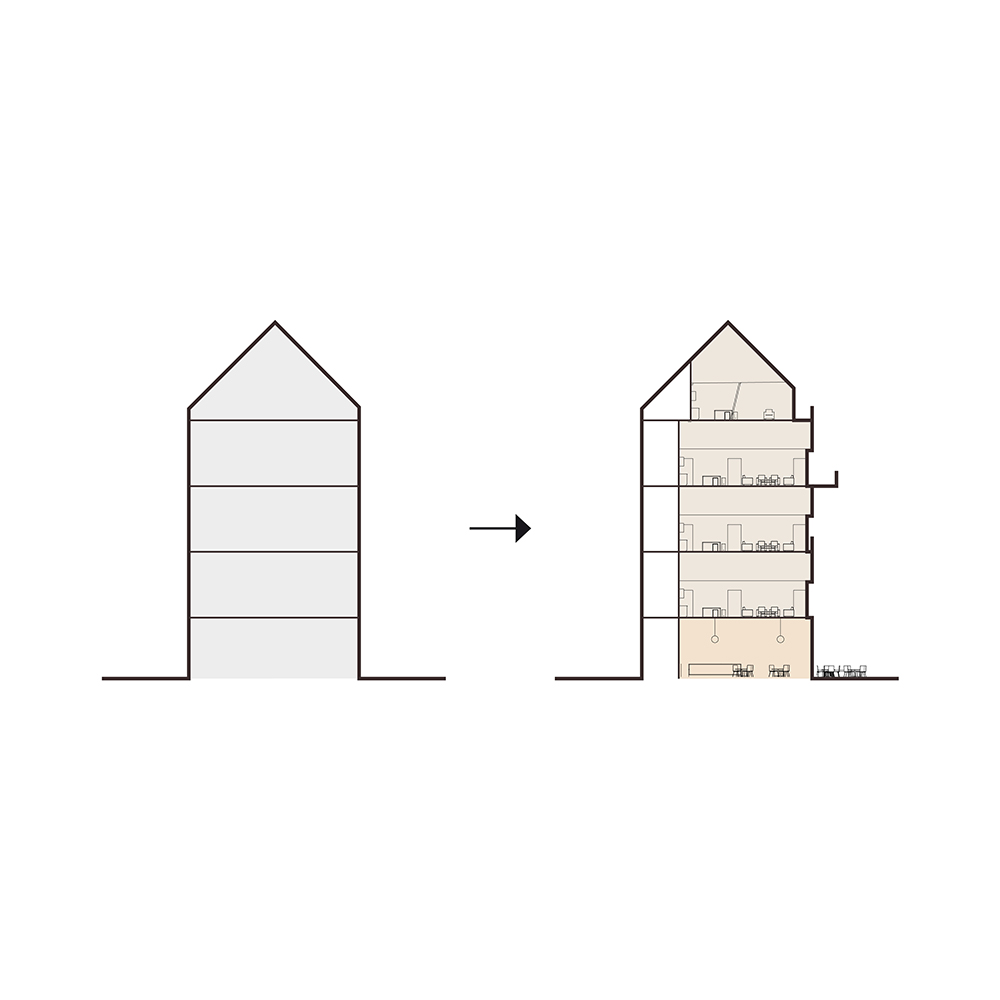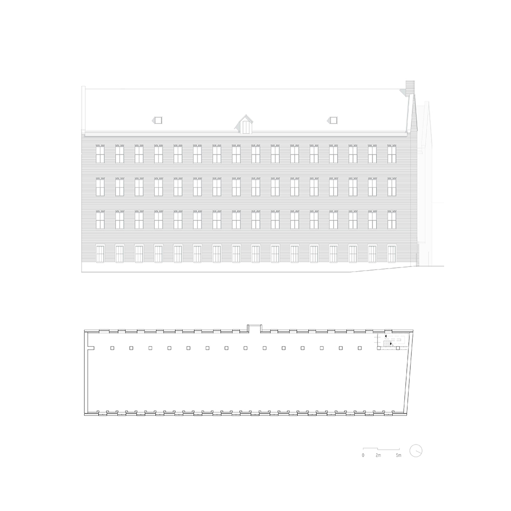 Τα μπαλκόνια έχουν φινίρισμα από μεταλλικά φύλλα και κιγκλιδώματα με πλέγμα μικρής οπής. Όλες οι προσθήκες όπως τα πλαίσια των κουφωμάτων και τα ανοιγόμενα τμήματα, τα μεταλλικά φύλλα και τα μπαλκόνια έχουν φινίρισμα σε σκούρο καφέ-μαύρο χρώμα, επιτρέποντας στη δεύτερη ζωή του κτηρίου να εκδηλωθεί ως ένα νέο αρχιτεκτονικό layer. Όλα τα ανοίγματα στο ισόγειο έχουν επεκταθεί μέχρι το έδαφος και είναι εξοπλισμένα με ψηλά χαλύβδινα πλαίσια, δημιουργώντας μια σχέση μεταξύ του εσωτερικού του εστιατορίου και της βεράντας της αγοράς. Χάρη στα σκουρόχρωμα μεταλλικά προφίλ, οι νέες είσοδοι στην αγορά έρχονται σε αντίθεση με την πρόσοψη από τούβλα.