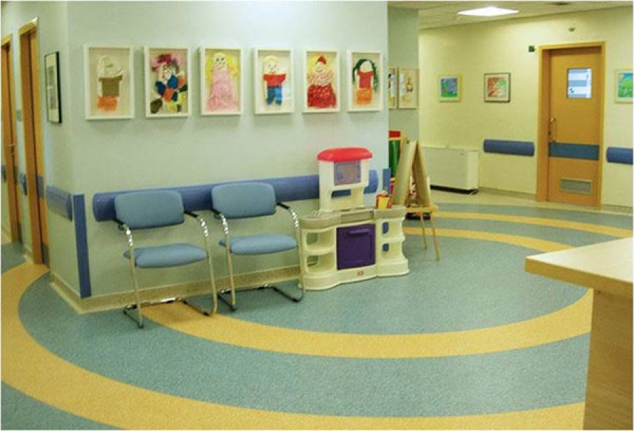 Κατά την πορεία του έργου αντιμετωπίστηκαν, επιτυχώς, απρόβλεπτα ζητήματα, που προέκυψαν και τα υλικά, τα οποία επιλέχθηκαν, ανταποκρίνονται πλήρως τόσο στις λειτουργικές όσο και στις αισθητικές απαιτήσεις του τμήματος. Η ψευδοροφή κατασκευάστηκε από μεταλλικό σκελετό, με υλικό πλήρωσης από λευκές πλάκες, τύπου ‘χειρουργείου’ με σκοπό τη δημιουργία άσηπτου περιβάλλοντος. Συγκεκριμένα, τοποθετήθηκαν πλάκες ορυκτών ινών, κλειστόπορες, ανθυγρές και άκαυστες, όπως επίσης τα τελειώματα της ψευδοροφής έγιναν από ανοδιωμένο αλουμίνιο, κατάλληλης διατομής και αντίστοιχου αισθητικού αποτελέσματος. Σύμφωνα με τη μελέτη φωτισμού, χρησιμοποιήθηκαν φωτιστικά λευκού χρωματισμού, τα οποία δημιουργούν ένα ήρεμο και ουδέτερο αποτέλεσμα. Αναφορικά με τις τοιχοποιίες, το κέλυφος και τα υποστυλώματα διατηρήθηκαν, ενώ η ξηρά δόμηση επιλέχθηκε για την εσωτερική διαρρύθμιση των χώρων (τοιχοπετάσματα από μεταλλικό σκελετό με διπλές ινογυψοσανίδες, υψηλής αντοχής, στις δύο πλευρές) και για εξωτερικές επιφάνειες (τσιμεντοσανίδες με ενισχυτικό υαλόπλεγμα. Ο χρωματισμός των τοιχοποιιών έγινε από οικολογική λαδομπογιά νερού, μη τοξική και άοσμη, σε αποχρώσεις επιλεγμένες βάσει χρωματολογικής μελέτης, ύστερα από έρευνα σε παραδείγματα εφαρμογής παιδοογκολογικών τμημάτων, ανά τον κόσμο. Το δάπεδο επιστρώθηκε με linoleum,το οποίο είναι φυσικό υλικό, με αντιβακτηριακές και αντιμικροβιακές ιδιότητες (με διαμορφωτικές γωνίες για τη δημιουργία κοίλου περιθωρίου), ενώ επιλέχθηκαν χαρούμενα χρώματα και ευφάνταστα σχέδια (Εικόνα 13).