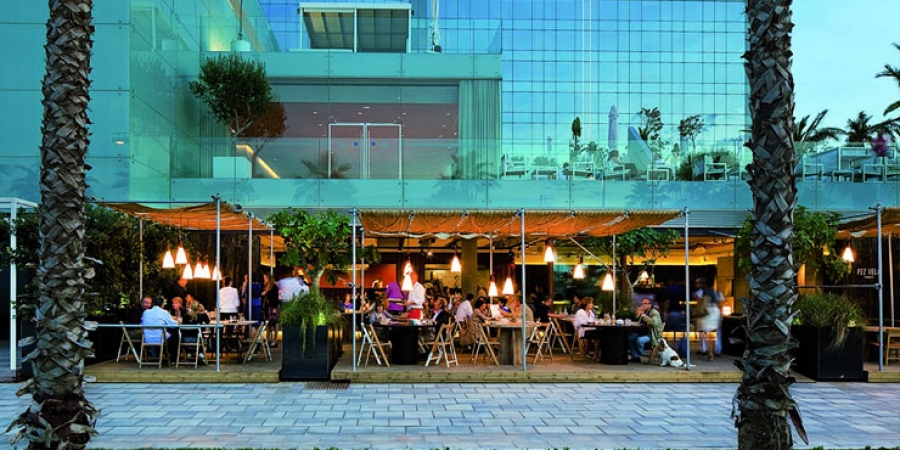 Το δάπεδο της βεράντας επενδύθηκε με ξύλο. Η βεράντα στεγάζεται με μια καλαμωτή πέργκολα ενώ ανάμεσα στα τραπέζια υπάρχουν συκιές.