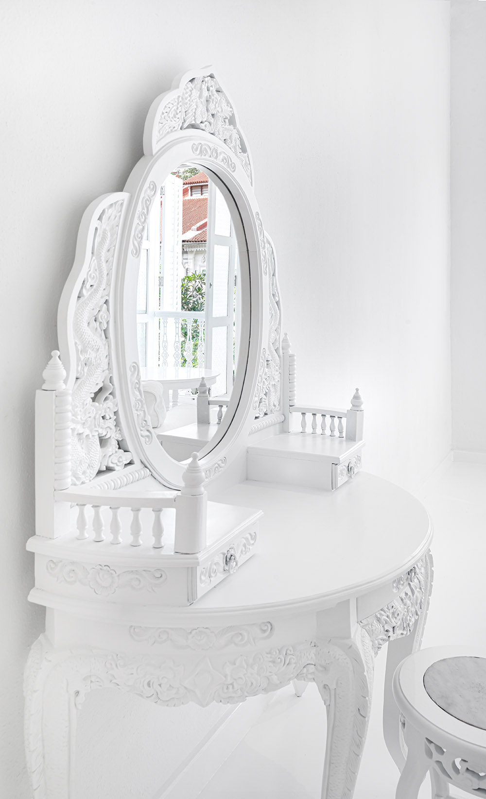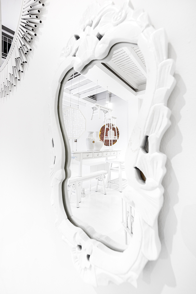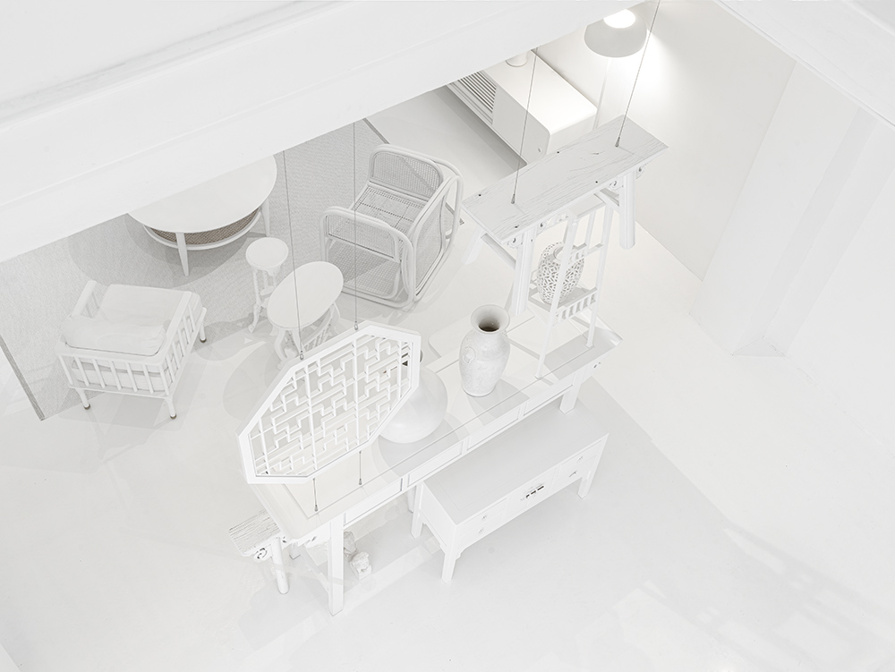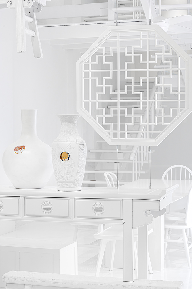 γ. Για να αποδώσουν φόρο τιμής στο παρελθόν, αλλά να του δώσουν το χαρακτήρα για το μέλλον, οι MOD έβαψαν τα κομμάτια όλα λευκά αλλά άφησαν σκαλισμένες αποκαλυπτικές βινιέτες στα διακοσμητικά κινέζικα βάζα, στα κεραμικά πιάτα τοίχου, στα ξύλινα παραβάν, στις τουαλέτες κρεβατοκάμαρας και στις καρέκλες.