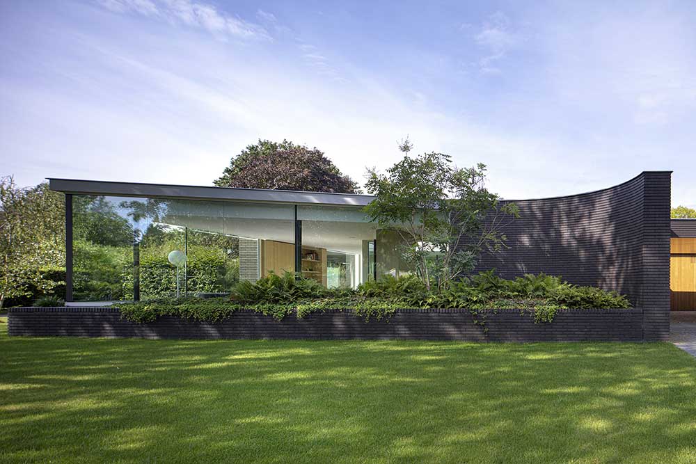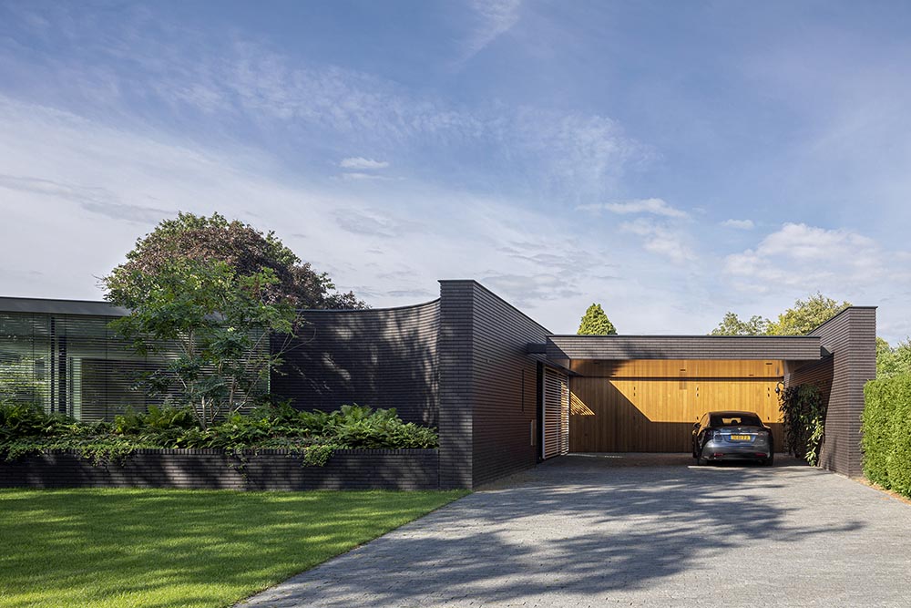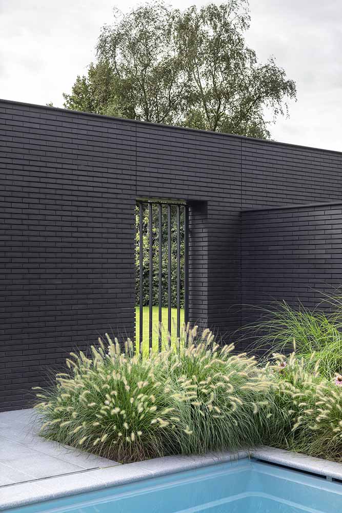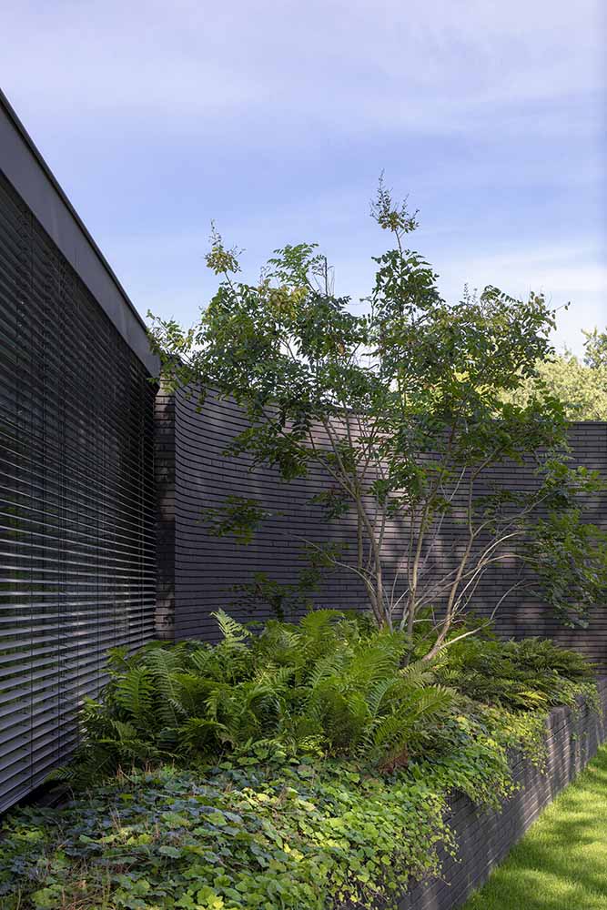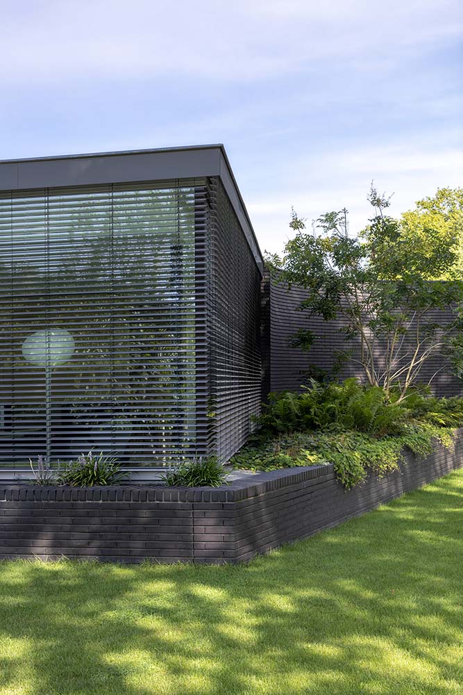 Όλες οι προσόψεις από μαύρο τούβλο κρύβουν και δείχνουν το φυσικό περιβάλλον, ενώ οι μεγάλες ενσωματωμένες ζαρντινιέρες με πράσινο είναι τοποθετημένες ακριβώς στο μπροστινό μέρος του κτηρίου. Το σπίτι είναι κατασκευασμένο για αποτελεσματική χρήση ενέργειας, με αποθήκευση ενέργειας, γεωθερμική αντλία θερμότητας και ηλιακούς συλλέκτες στην οροφή. Ο στόχος ήταν να συνδεθεί το εσωτερικό με το εξωτερικό με φυσικό τρόπο.