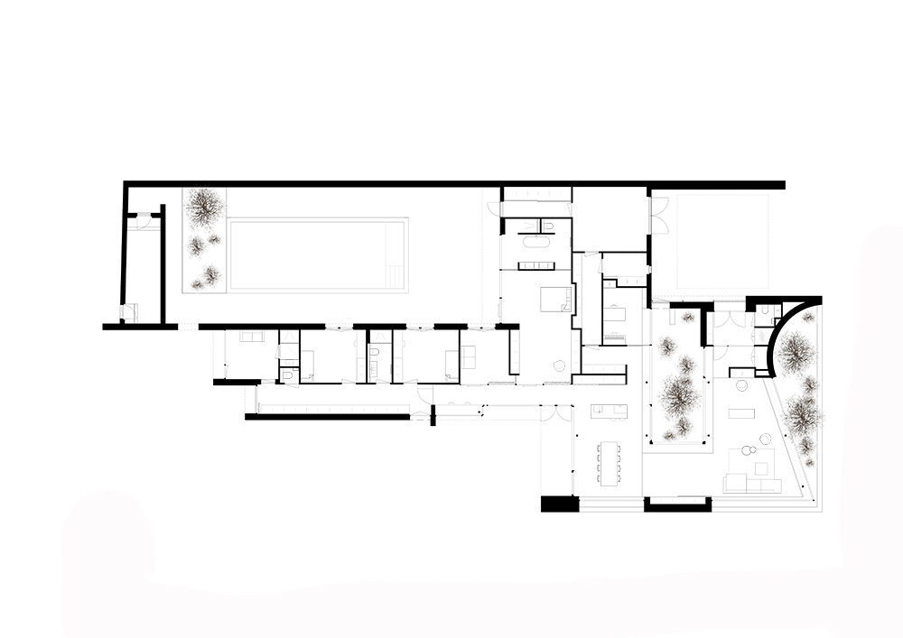 Παραδόξως αυτό το σπίτι έχει ανοιχτή θέα από πολλές πλευρές και διαφάνεια στις προσόψεις, αλλά ταυτόχρονα αισθάνεται ιδιωτικό και προστατευμένο από την πλούσια πράσινη φύτευση και την έξυπνη οργάνωση στη διάταξή του. Ένα τέλειο καταφύγιο για να περάσετε το χρόνο σας μέσα και έξω. Η απέριττη και καθαρή παλέτα των υλικών δημιουργεί μια χαλαρή ατμόσφαιρα φυσικής πολυτέλειας.