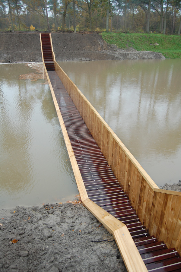 Η κατασκευή είναι ξύλινη και πλήρως αδιαβροχοποιημένη με την τοποθέτηση μεμβράνης (EPDM foil). Από μακριά δεν διακρίνεται σχεδόν καθόλου καθώς η στάθμη του νερού αλλά και του εδάφους φτάνουν μέχρι το χείλος του χαρακώματος.