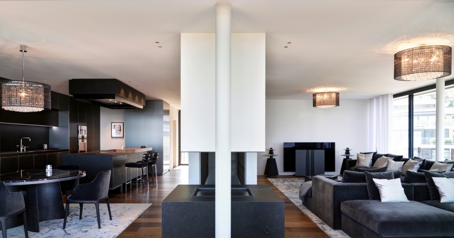 Το ευρύχωρο master bedroom με ενσωματωμένη γκαρνταρόμπα και ιδιωτικό μπάνιο ανοίγει σε ξεχωριστό κήπο στη βόρεια πλευρά του διαμερίσματος, ενώ άλλα δύο δωμάτια βλέπουν νοτιοανατολικά. Το εξαιρετικά ευρύχωρο σαλόνι και η τραπεζαρία με ανοιχτή κουζίνα 107 m2 καταλαμβάνει το μπροστινό μέρος του διαμερίσματος και επωφελείται από τη συναρπαστική θέα στη λίμνη της Ζυρίχης.
