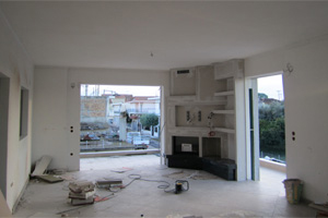 Ένα αρκετά ενδιαφέρον σημείο στο χώρο του καθιστικού είναι η γωνία του τζακιού και ειδικά το παιχνίδι των διαφόρων όγκων και επιπέδων (ο τρόπος δηλαδή που αλληλοπλέκονται τα ράφια και οι εσοχές στο σημείο του τζακιού). Συνεπώς, θα επιδιώξουμε να τονίσουμε ακριβώς αυτό το αλληλοπλέξιμο.