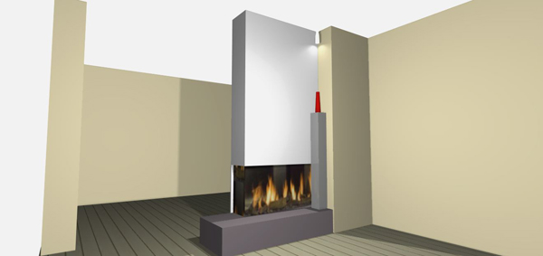 Σε υπερυψωμένη βάση τοποθετείται το τζάκι και το μοναδικό υψηλό στοιχείο είναι η καμινάδα του, που με την επένδυση της διαμορφώνει μια κολώνα.