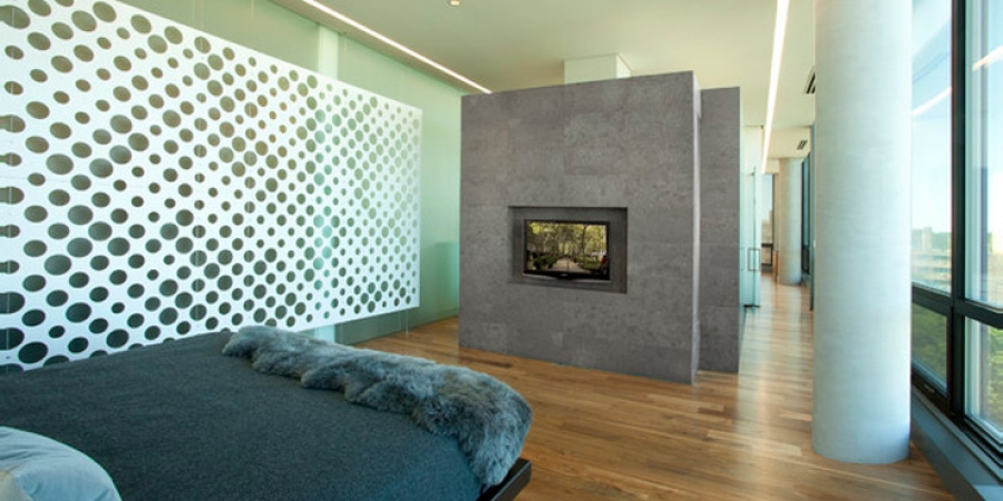 Αν ο χώρος σας έχει σύγχρονη αισθητική με υλικά όπως το μέταλλο, το γυαλί και το δέρμα τότε μπορείτε να τοποθετήσετε εμπρός από το παράθυρο ένα διάτρητο μεταλλικό φύλλο, για παράδειγμα από χαλκό. Δείτε ένα παράδειγμα, τέτοιου διάτρητου πάνελ σε υπνοδωμάτιο.