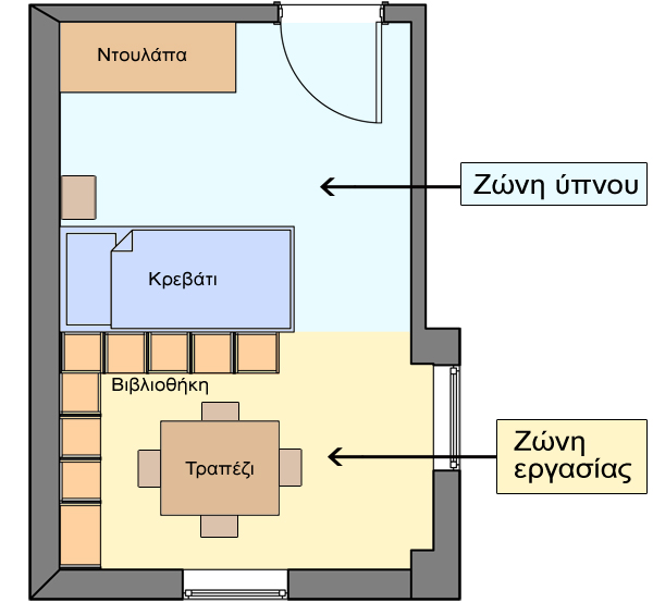 Για να διαχωριστεί η ζώνη του ύπνου από τη ζώνη μελέτης μπορεί να κατασκευαστεί ένα έπιπλο, όπως για παράδειγμα μια βιβλιοθήκη. Το έπιπλο αυτό δεν χρειάζεται να είναι πολύ ψηλό, να φτάνει δηλαδή μέχρι την οροφή, έτσι ώστε να μην εμποδίζει το φυσικό φώς να εισέρχεται σε όλο το δωμάτιο. Το ύψος για παράδειγμα της βιβλιοθήκης μπορεί να κυμαίνεται μεταξύ 1.60 έως 1.70 μέτρων.