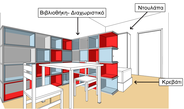 Στα περισσότερα κενά της βιβλιοθήκης μπορούν να τοποθετηθούν κουτιά σε έντονα χρώματα. Μερικά κουτιά μπορούν να κοιτούν προς το κρεβάτι και μερικά προς τη περιοχή εργασίας.
