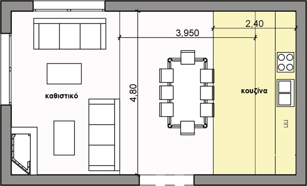 “Έχω ένα σαλόνι ενιαίο με κουζίνα συνολικών διαστάσεων 8,30 χ 4,80μ. Η κουζίνα κατέχει 4,80 χ 2,40μ του συνολικού χώρου. Απέναντι της κουζίνας στην άλλη άκρη του σαλονιού είναι 2 μπαλκονόπορτες (2,10μ μήκος) τοποθετημένες στη μια γωνία του σαλονιού. Στην άλλη βρίσκεται ένα τζάκι. Θέλω να τοποθετήσω καθιστικό πλάι στο τζάκι (ιδανικά να χωράει 6 άτομα), και να δημιουργηθεί αρκετός χώρος για το μπιλιάρδο που θα είναι και τραπεζαρία." Δημήτρης