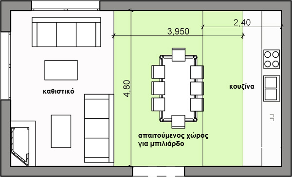 Ο απαιτούμενος χώρος για παιχνίδι είναι 4,90μx3,95μ., οπότε το τραπέζι μπιλιάρδου πρέπει να τοποθετηθεί στα 2.40μ (μετά το χώρο της κουζίνας) και να ταυτίζεται ο ελεύθερος χώρος του μπιλιάρδου δεξιά με το διάδρομο της κουζίνας.