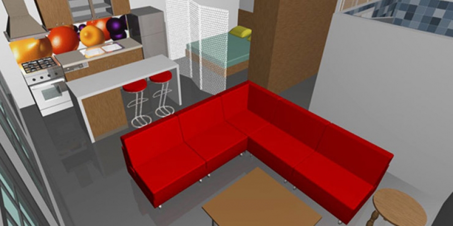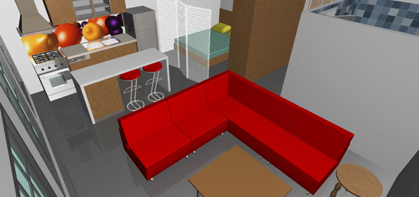 Δεξιά διαμορφώνουμε χώρο ύπνου, που οριοθετείται με τις ντουλάπες και ένα ελαφρύ, χαμηλό διαχωριστικό από την περιοχή της κουζίνας.