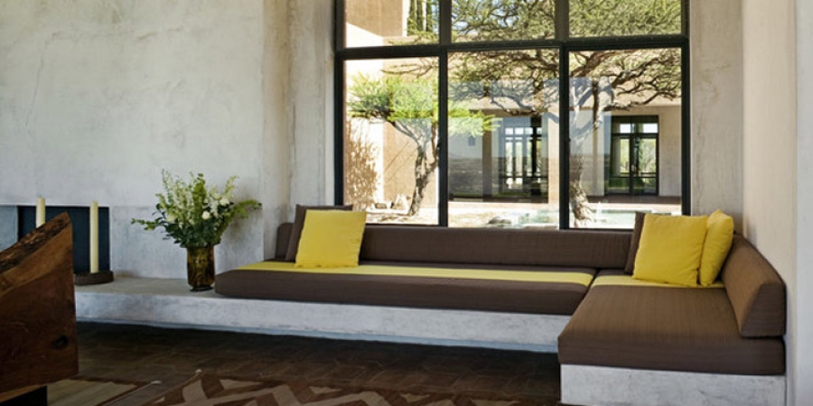 Οι χτιστοί καναπέδες συνήθως ντύνονται με στρώματα και μαξιλάρια, στα οποία προσθέτουμε μικρότερα μαξιλάρια σε εντονότερα χρώματα.