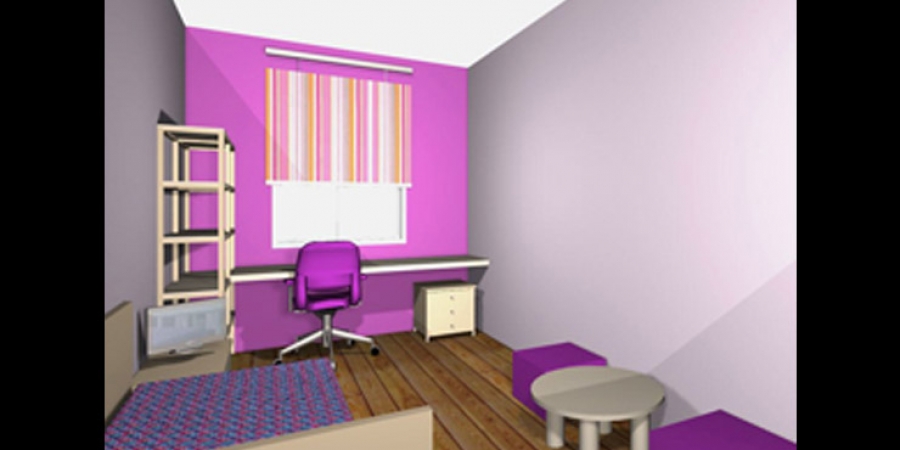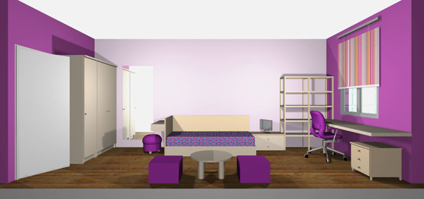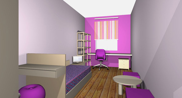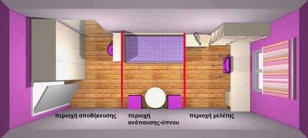 Το δωμάτιο χωρίζεται σε τρεις ζώνες: αποθήκευσης (ντουλάπα), ανάπαυσης- ύπνου (κρεβάτι) και μελέτης (γραφείο).