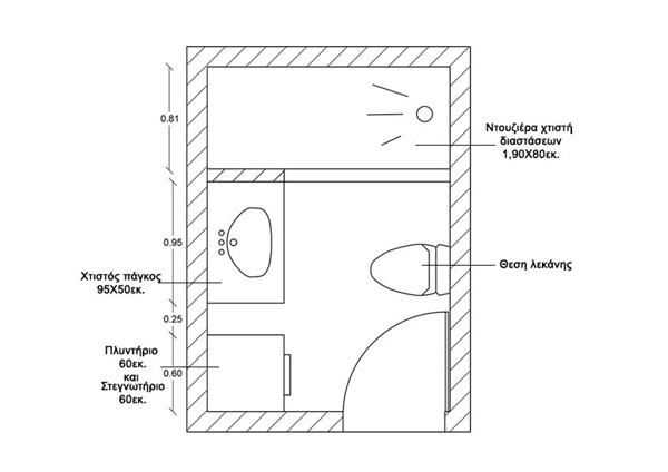 Μας λείπουν βασικές πληροφορίες για τη σωστή τοποθέτηση των ειδών υγιεινής. Πρέπει να γνωρίζουμε που είναι η αποχέτευση γιατί δεν μετακινείται εύκολα (θέση λεκάνης) και που βρίσκεται η πόρτα του μπάνιου. Πήραμε ως δεδομένο και τις 2 περιπτώσεις τοποθέτησης της πόρτας, στο 1,90 και στο 2,70.