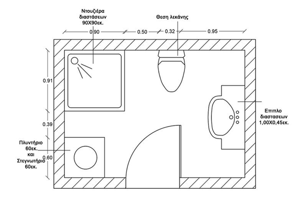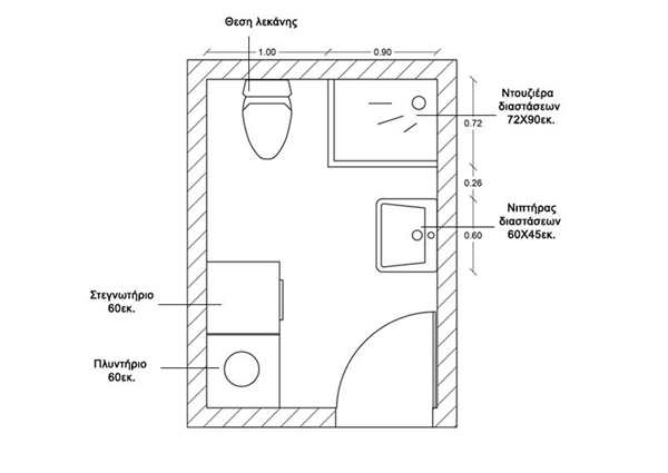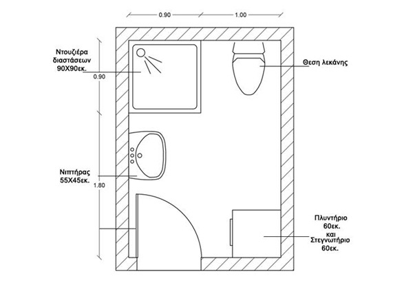 Σε αυτή τη λύση αλλάζει η θέση της λεκάνης και η ντουζιέρα γίνεται 72Χ90 ή 90Χ90.