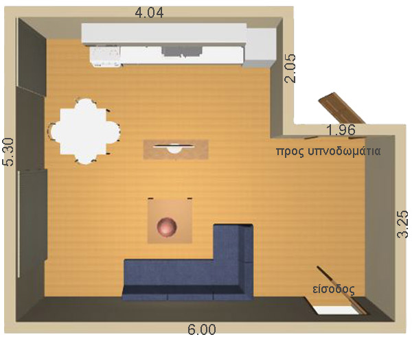 - Τέλος ο γωνιακός καναπές τοποθετείται απέναντι από το έπιπλο της TV με πλάτη τη μεγάλη πλευρά στον τοίχο της εισόδου και τη μικρή πλευρά απέναντι από την μπαλκονόπορτα.