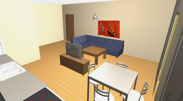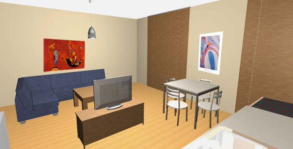 - Μια μικρή τετράγωνη τραπεζαρία τοποθετείται στον τοίχο ανάμεσα στις δύο μπαλκονόπορτες στην περιοχή της κουζίνας.