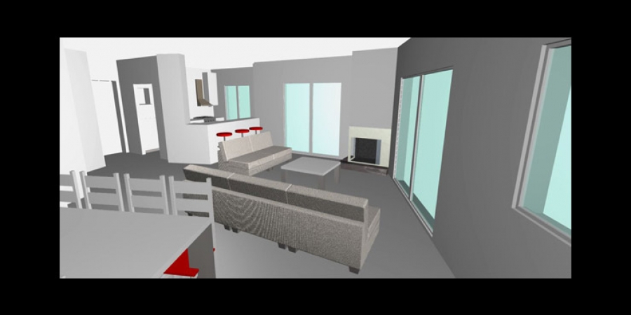 Προτείνουμε είτε γωνιακό καναπέ, είτε δύο καναπέδες σε γωνία μπροστά από τζάκι αναδεικνύοντας το έτσι ως κεντρικό σημείο του χώρου. Η τοποθέτηση του σαλονιού γίνεται με αλλαγή του άξονα, δηλ. παράλληλα προς τη λοξή πλευρά του χώρου, ώστε να ακολουθήσει τη μορφή της κάτοψης και να προσδώσει δυναμικότητα στο χώρο.