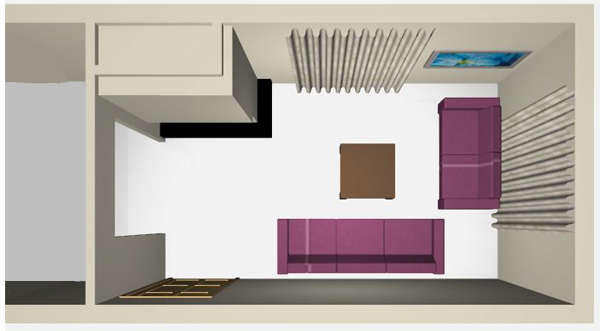 Αφενός το πλάτος του χώρου είναι μικρό και σε συνδυασμό με τη θέση του τζακιού (απέναντι από την πόρτα) δεν είναι εφικτή η τοποθέτηση καναπέ απέναντι από το τζάκι. Άλλωστε από το σημείο αυτό γίνεται η επικοινωνία με την τραπεζαρία και την κουζίνα. Μένει λοιπόν ο χώρος στη δεξιά πλευρά να αξιοποιηθεί. Υπάρχουν όμως δύο μπαλκονόπορτες στους δύο κάθετους τοίχους και μικρή επιφάνεια ανάπτυξης του καθιστικού. Οπότε λαμβάνουμε την απόφαση να αντιμετωπίσουμε την μπαλκονόπορτα της στενής πλευράς ως παράθυρο, δηλ. να αποκλείσουμε τη διέλευση μέσω αυτής, ώστε να δημιουργήσουμε μια γωνιά σαλονιού στην κάτω δεξιά γωνία του χώρου με ταυτόχρονη θέα στο τζάκι και την μπαλκονόπορτα στα δεξιά του. Η τηλεόραση τοποθετείται επίτοιχα στον ελεύθερο τοίχο και η ακριβής θέση της θα επιλεγεί από σας, καθώς δεν γνωρίζουμε την απόσταση της από τζάκι.