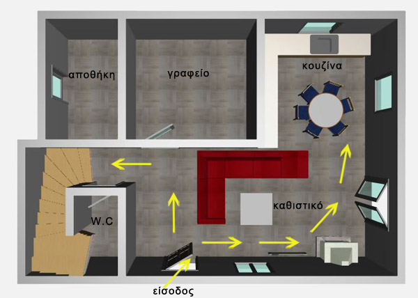 Στο σχέδιο σημαίνεται με βελάκια η πορεία μέσα στο χώρο, που είναι ανεμπόδιστη από έπιπλα και τα φύλλα του ανοιγόμενου κουφώματος.